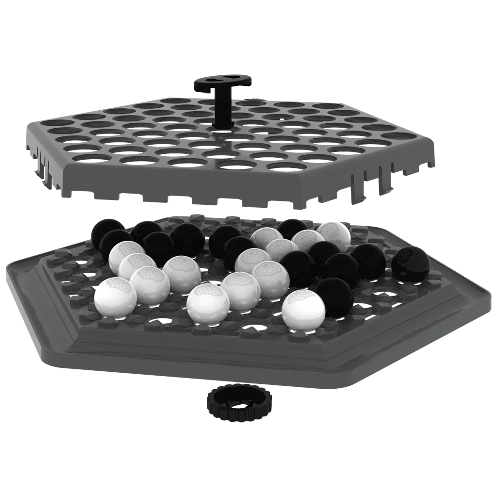 Un juego de mesa de estrategia para dos jugadores en el que cada jugador controla canicas de colores opuestos sobre un tablero hexagonal. El objetivo del juego es echar del tablero seis canicas del oponente.