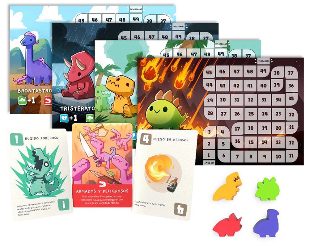 Es un juego competitivo de supervivencia muy fácil de aprender, ideal para iniciar una tarde de juegos o para disfrutar con toda la familia. La meta es simple: ser el último dinosaurio en pie.